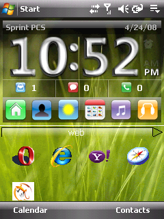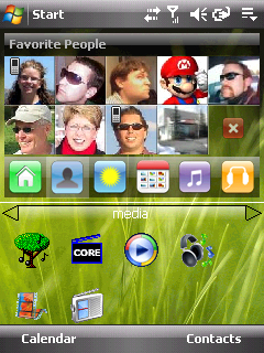 This plug in for the PPC desktop (aka Today screen) gives me lots of useful options. In this picture you can see my favorite contacts. You can tap them to call them. This program also has a clock display, quick links to see email messags, text messages, or missed calls. It also has a weather plugin, app launcher, integrated controls for a built in media player, and last but not least, one touch access to set the phone ringer settings (i.e. vibrate, ringer loud, silent, etc).