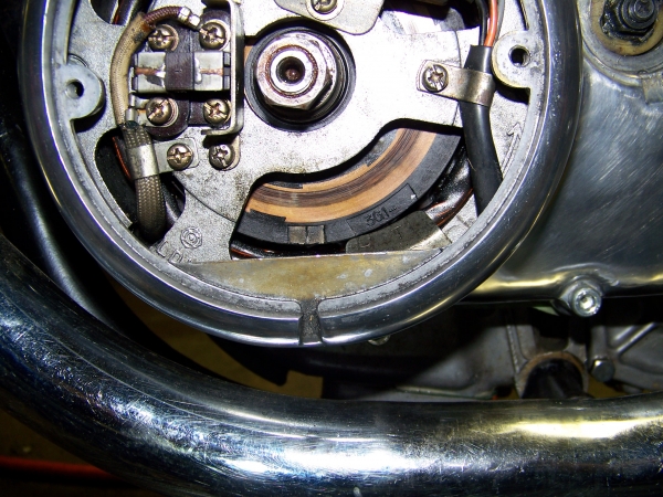 line up mark on stator with left part of cutout on cover for correct boyer timing (full advance)