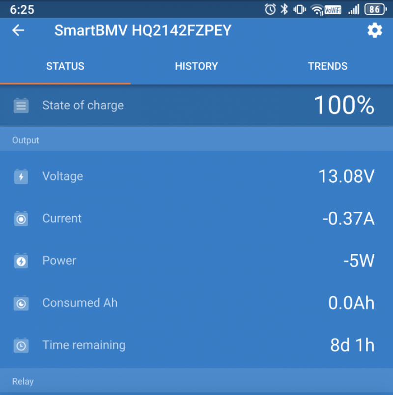 Victron app showing that 2x LED bulbs use 5 watts, vs 18 watts for one old bulb, 86% reduction