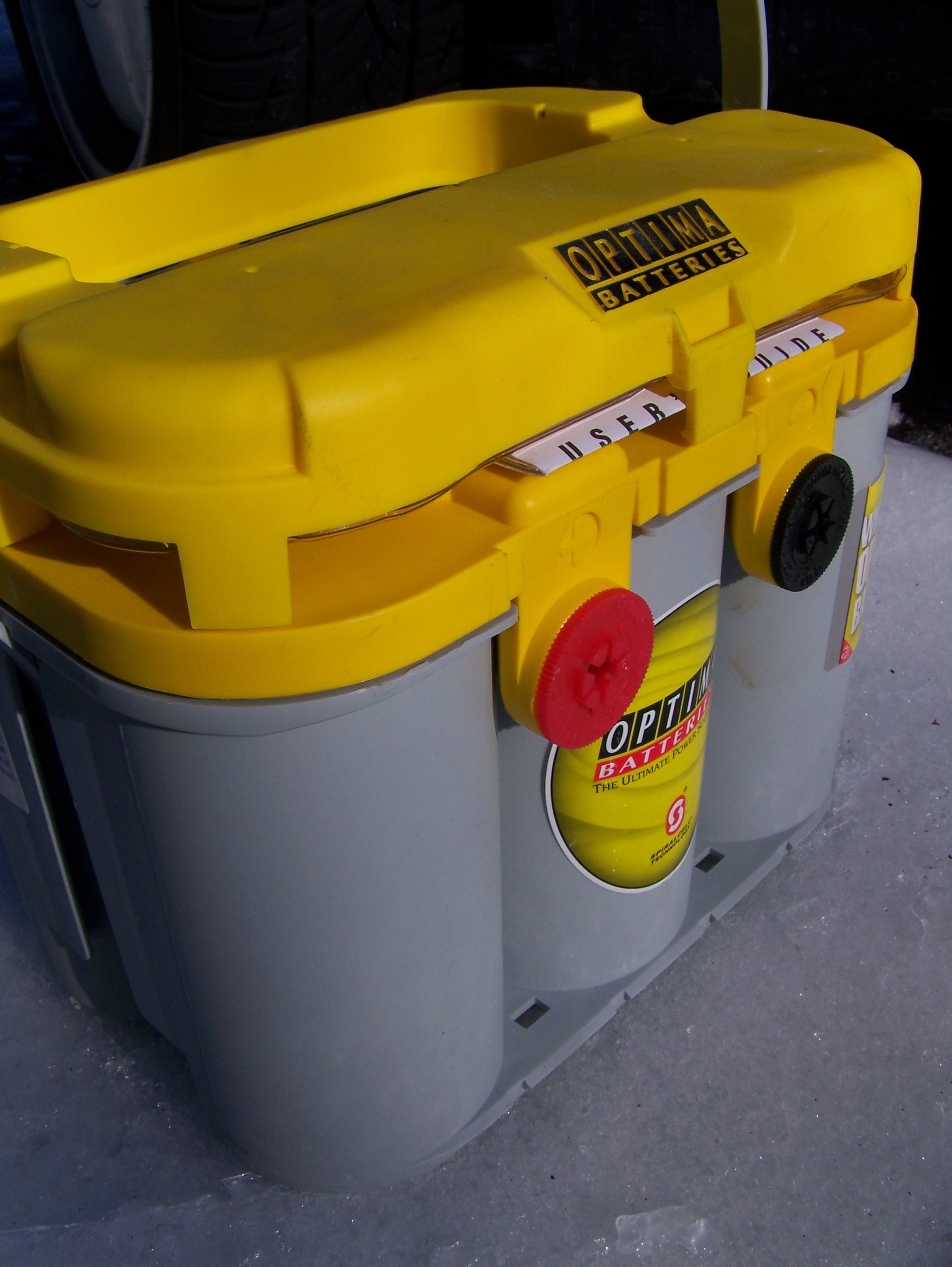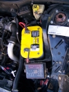 My old battery finally died. It was in the car when I bought it about a year ago. The stickers were not punched out so I dont know how old it actually was. I am the first to admit I am hard on batteries. I often install computers or stereo equipment in cars and end up completely draining the battery on accident. Thats why I decided to get an Optima Yellow Top deep cycle battery. It has no problems being completely discharged then recharged. It also has 100 more cold cranking amps (CCA) then my past battery and it fits nicely in the factory battery tray. I had to make a special strap for the last battery so I could get past the state inspection. Pictures