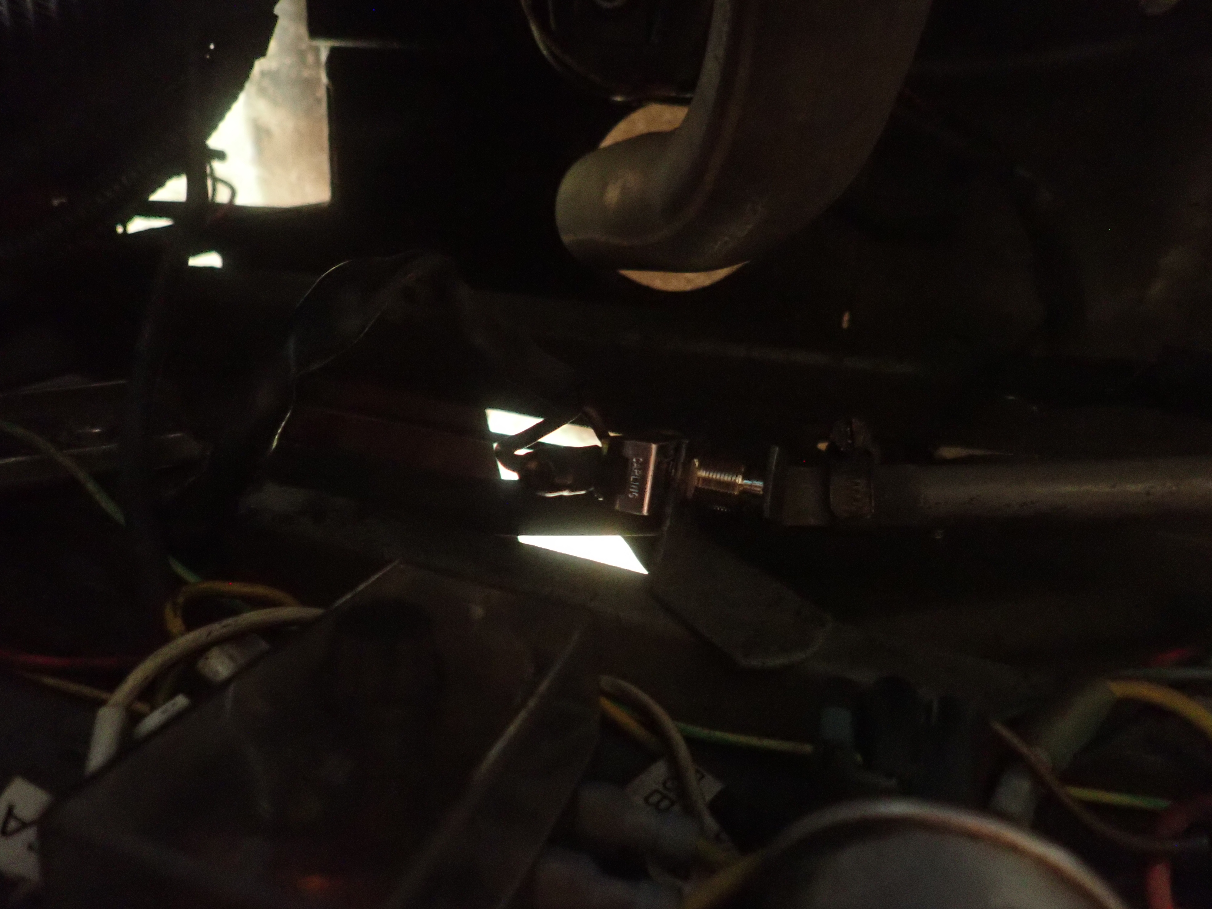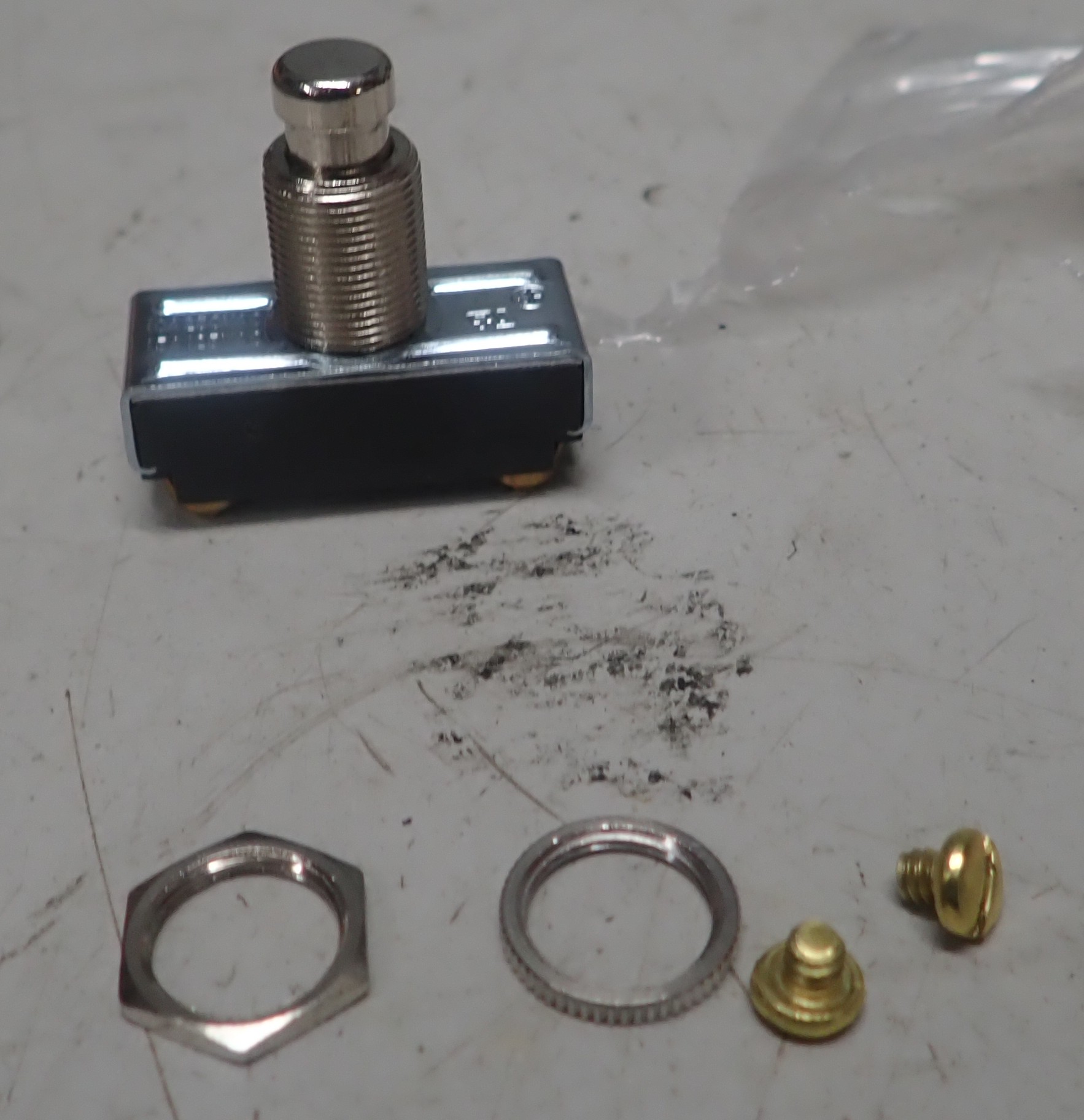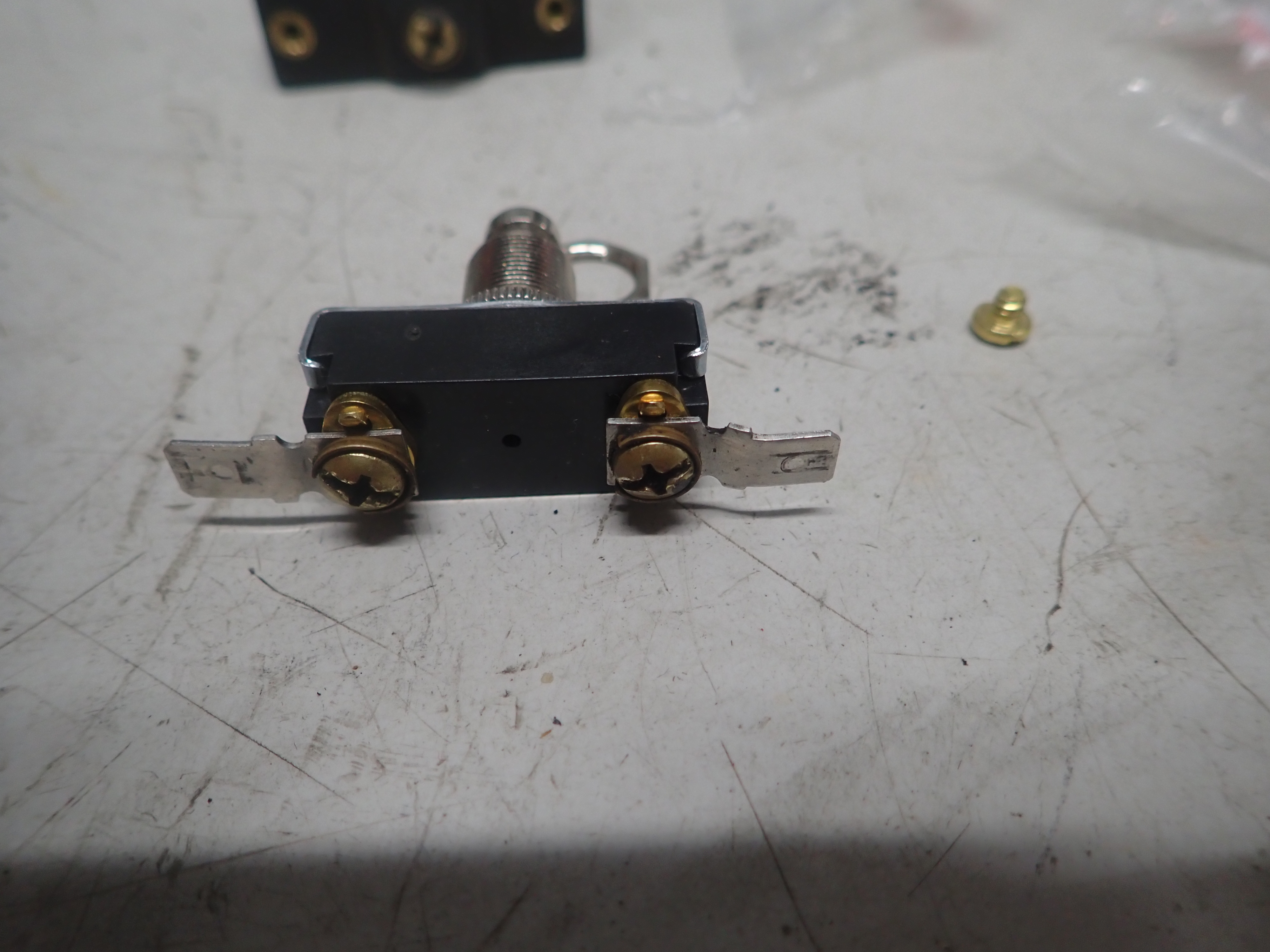 Old switch broke. It is an interesting switch... a momentary switch that the full current of the lights goes through. Also its normally open, push to close (AKA push to turn off the lights). At first I went to my local auto parts store and got a 20 amp momentary push button switch. Two problems, it was plastic and moved around enough it wasn't reliable. Second, it was normally closed (N.C) meaning it was off when I asked for the headlights to be on.
