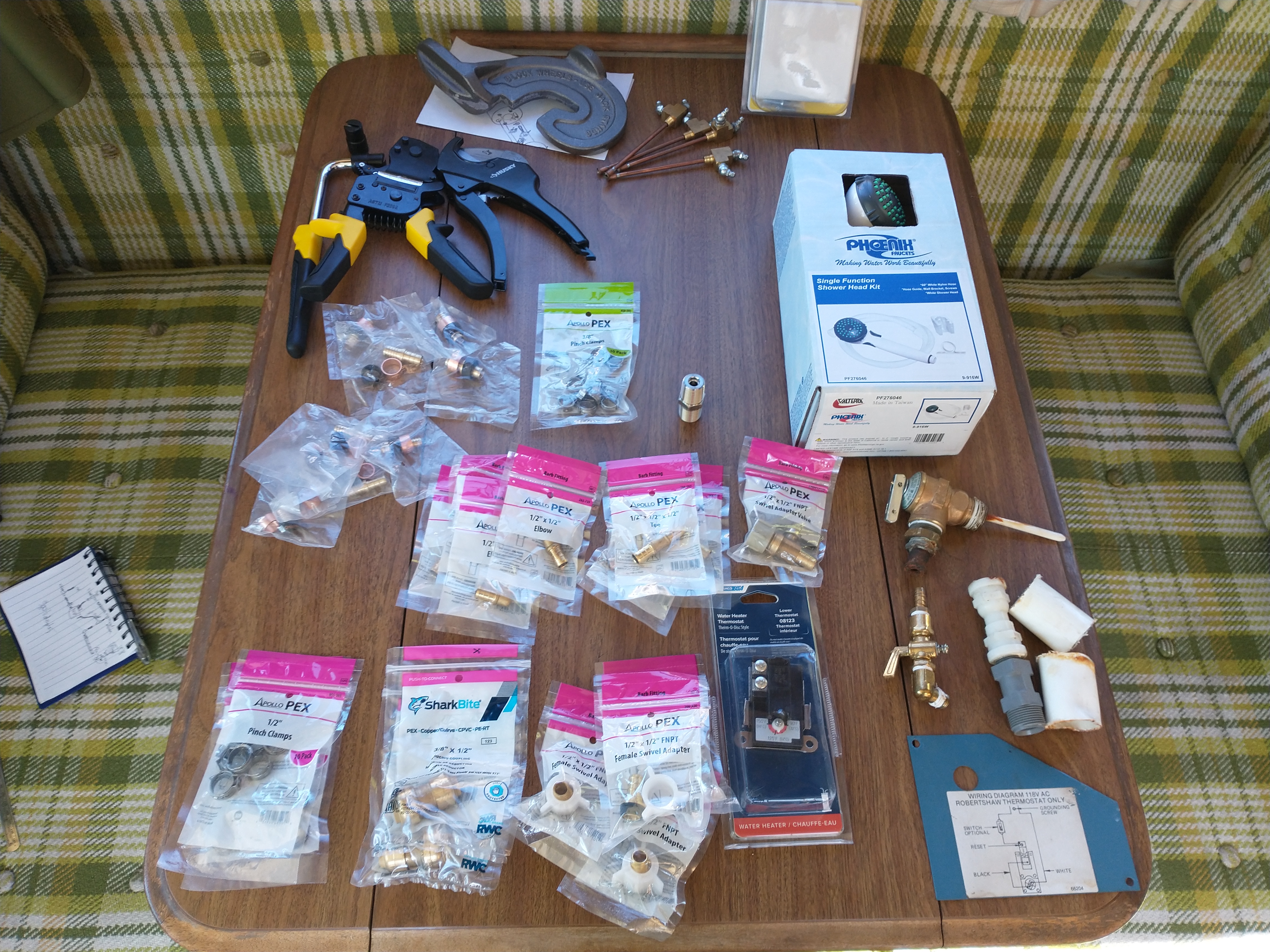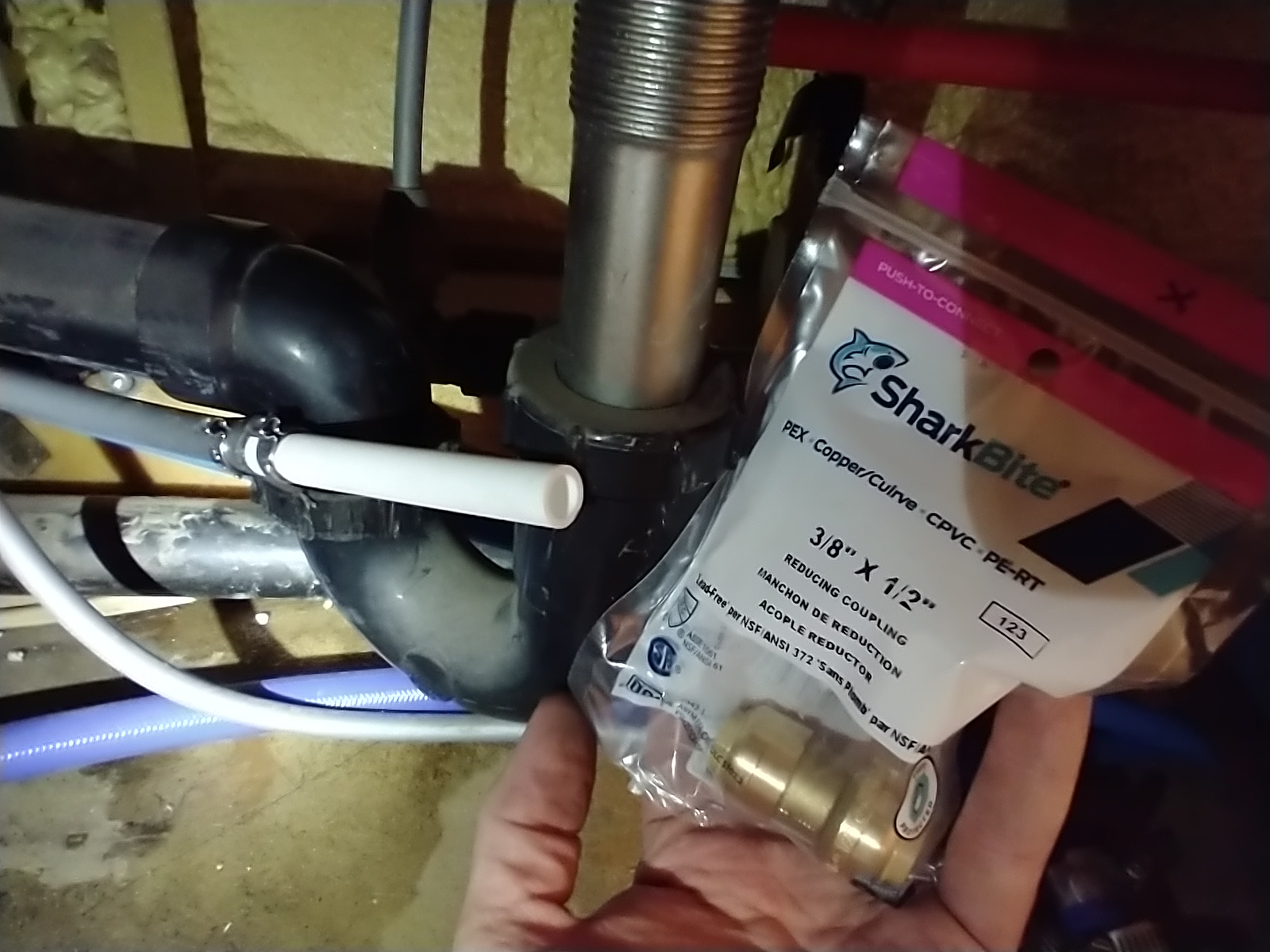 | | gray pb already coupled to pex (both 3/8"). Now temporary shark bite goes from 3/8" pex to 1/2" pex | | | this let me avoid replacing water lines to kitchet at this time | | |