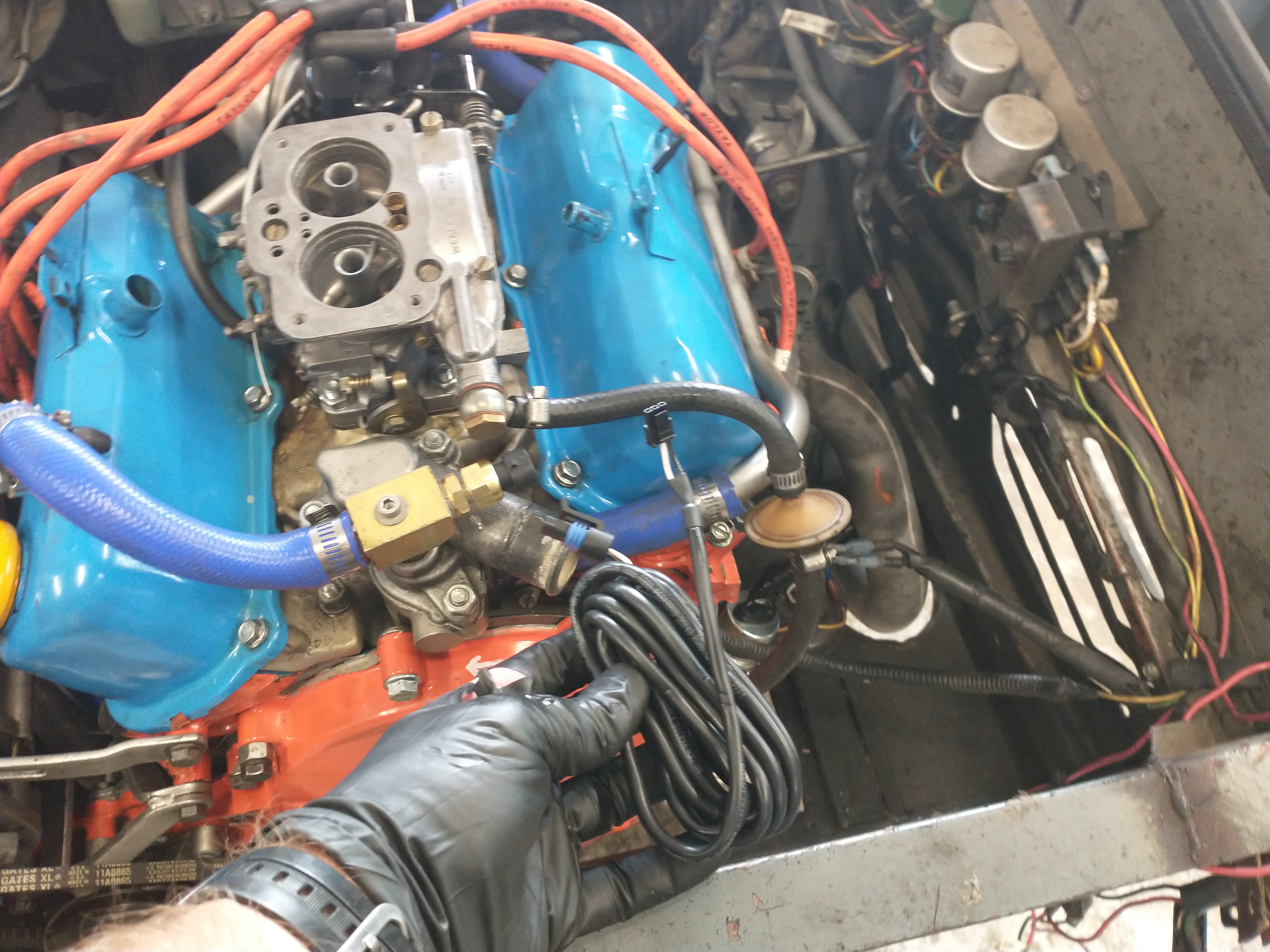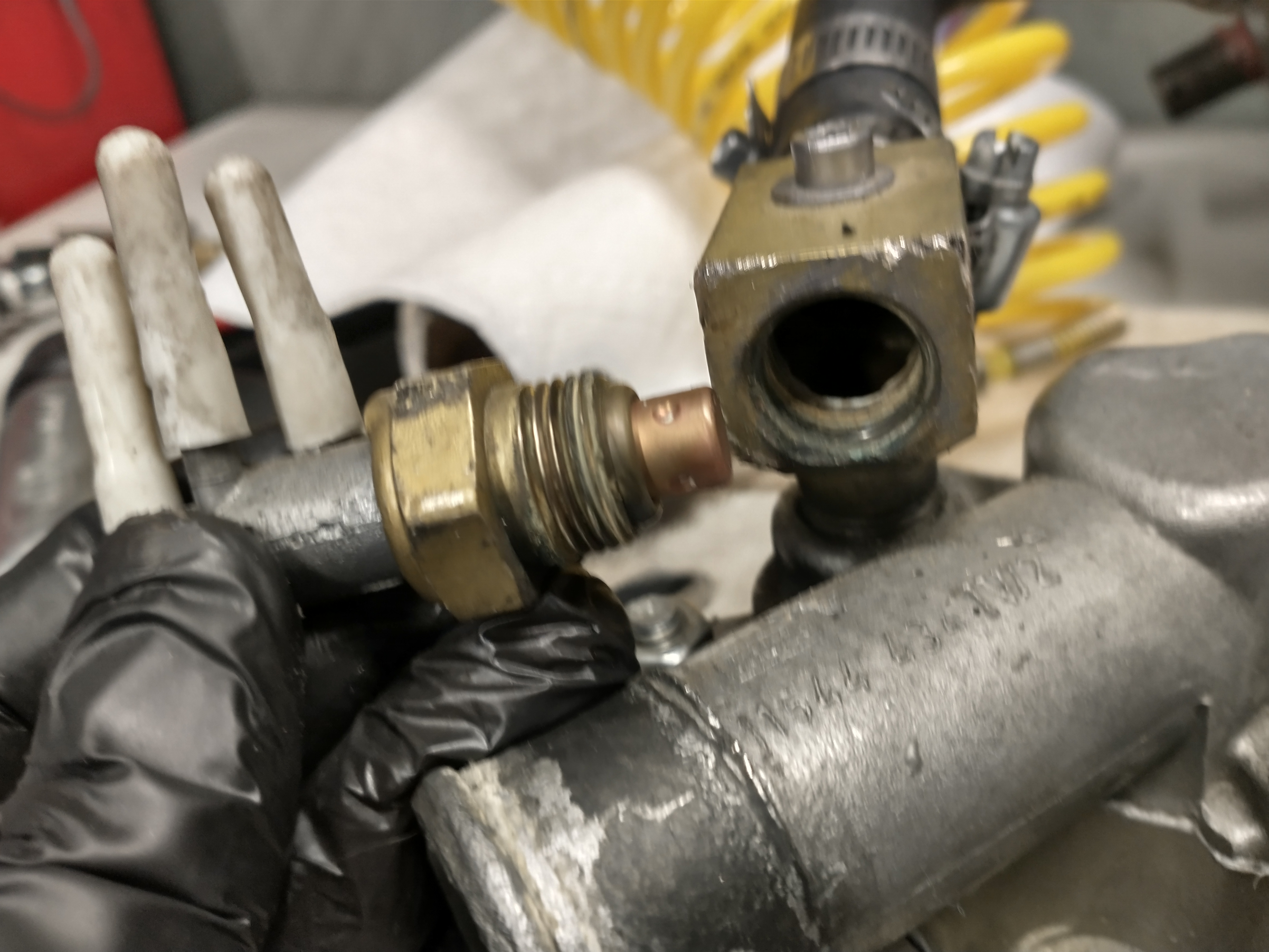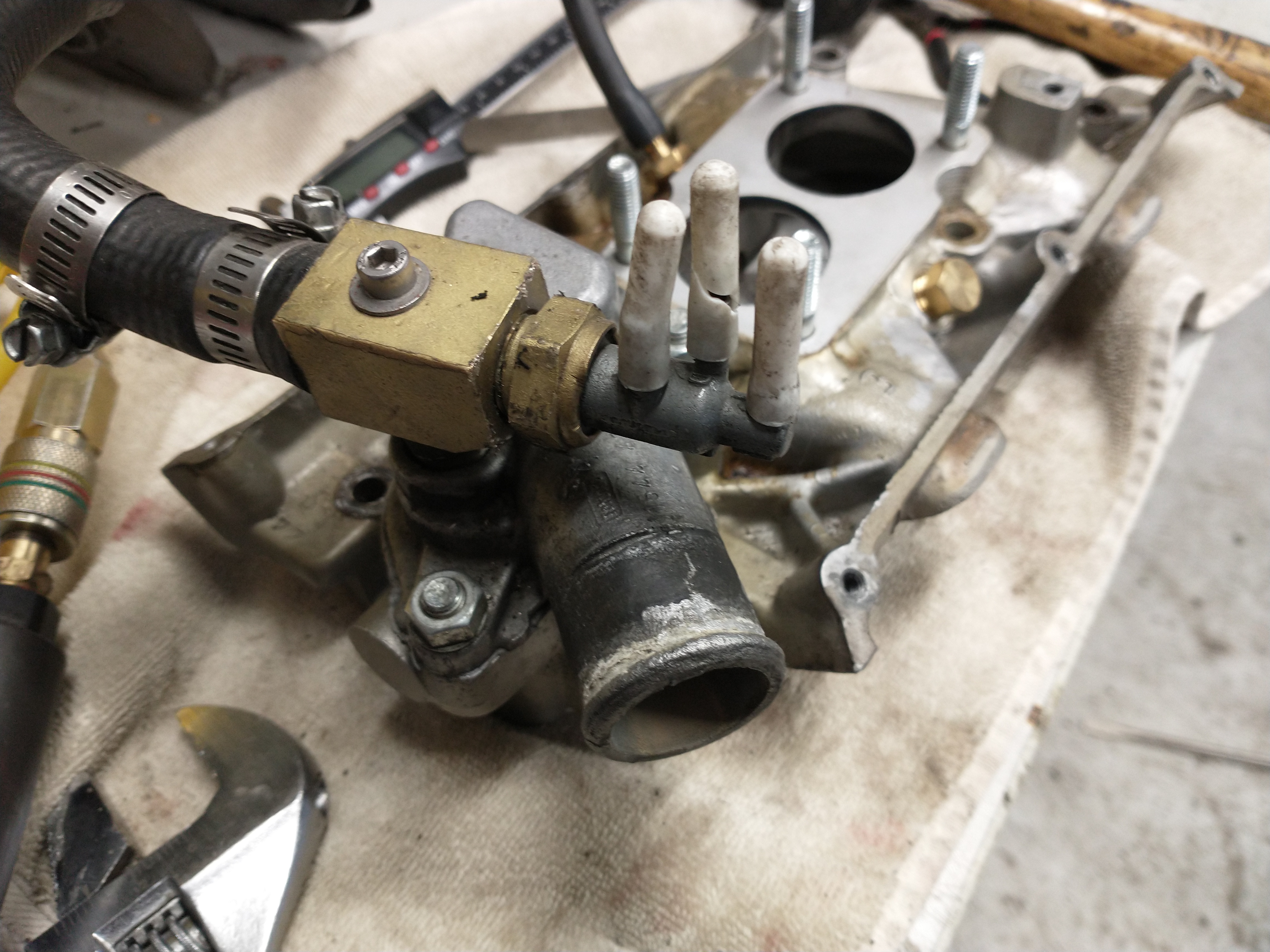 The factory ford carb utilized a temperature sensitive vacuum manifold that tied into the thermostat housing. After installing my weber carb, I just capped off those vacuum lines. I decided to remove the manifold entirely and low and behold, my new coolant temperature sensor threaded right in! Amazing, something went well for once. The only downside of this location is that its pretty high up so coolant needs to be flowing in order for it to read an accurate temperature. Although it does not require the thermostat to be open to give accurate readings. If there are any air bubbles in the system, this sensor won't give you accurate readings whereas the factory sensor will.